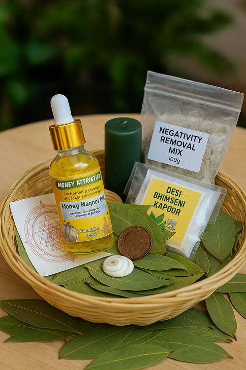 A powerful set to attract wealth, remove negativity, and boost positive energy. Includes Money Magnet Oil, Negativity Removal Mix, Desi Bhimseni Kapoor,